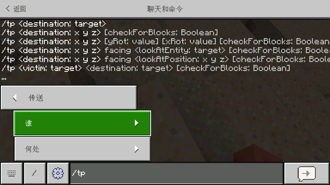 输入斜杠符号后,系统会自动弹出可用指令列表,其中包含“传送”选项