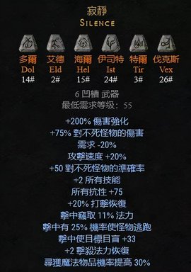 如果您拥有六孔的弓或弩,那么可以考虑制作这款符文之语。其属性较为全面,且制作成本也并非过高。击中逃跑功能能够有效提升玩家的生存能力,对于近战职业可能会带来一定困扰,而对于远程职业则有助于提高安全性,尤其是在牛场等危险区域。