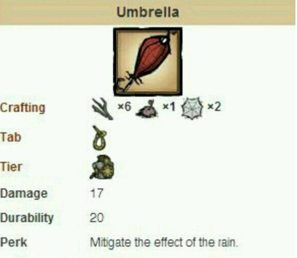 雨伞的排名如此之高,很多人可能不理解,认为雨伞只在下雨的时候使用。事实上,雨伞也有120秒的隔热效果,加上90%的防水,而且雨伞所需的材料只有6根树枝、2张蜘蛛网和1张猪皮。这些材料很容易买到,打开雨伞只需要一本书。蜘蛛网愿意杀死蜘蛛,并有机会放下它们,或者拆除蜘蛛窝。从一级蜘蛛窝里掉下来的蜘蛛网足以做一把伞。