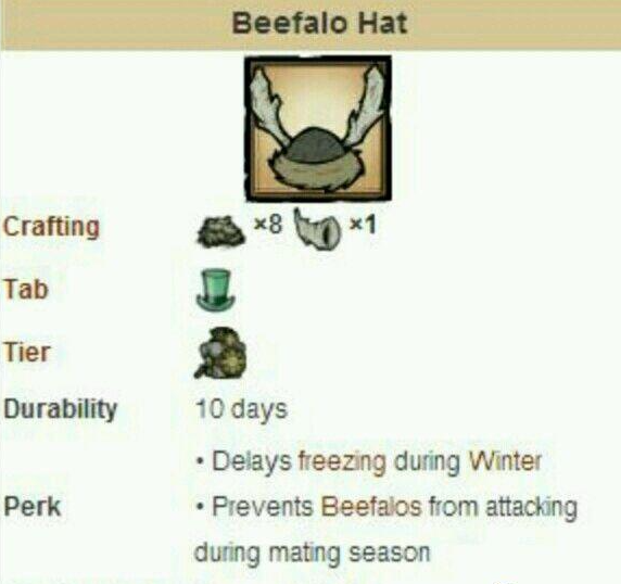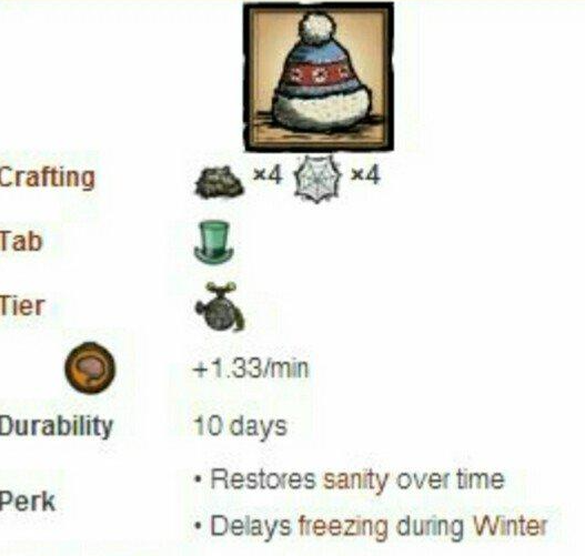 冬帽和牛皮帽基本上是每个玩家进入冬季前必备的服装。冬天不建议做棉质外套,因为这件外套会占据盔甲和背包的格子。冬天也是探索图片的季节,你可能会收获很多东西,所以最好背上一个袋子。(没有提到五个装备栏)冬帽价格低廉,可以提供+1、33桑/分钟的精神恢复。制作它只需要4张牛皮和4张蜘蛛网。冬帽也有一些缺点,那就是它的使用期只有短短的10天。