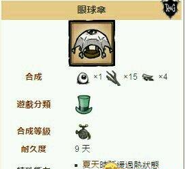 眼球伞的主要材料是巨鹿掉落的眼球。许多在冬天之前被高级玩家杀死的古代犀牛正在等待巨型鹿的到来来制造眼球炮塔。有多少学生是这样的(lz默默地举起了手)?事实上,许多玩家选择制作炮塔而不是眼球伞。事实上,眼球伞有很多好处,包括1、100%的防雨。防雷,以及3。夏季保温240秒。因此,眼球伞是春夏的神器。在夏天,你不需要在制作冰帽或花衬衫上花费精力。一把眼球伞基本上就足够了。