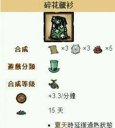 碎花衬衫应该是大多数球员夏天的首选。这里还有一些其他防暑衣物。春鹅掉落的羽毛可以用来制作羽毛扇,搅拌后可以降温。由巨鹿掉落的眼球制成的眼球伞还可以达到240秒的隔热效果。这两种衣服在预防中暑方面非常有效,但成本并不低。有条件的玩家可以制造它们,当然,保持他们的眼睛对合成炮塔也很实用。
