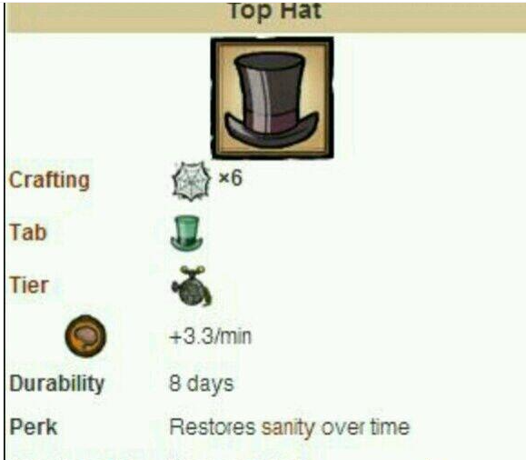 高帽是饥荒早期返回桑的神奇工具,成本低,桑值收入高。它只需要6张蜘蛛网,白天佩戴时为+3、3san/min。黄昏和夜晚,它固定在-5san/min。戴上高帽子后,它只需要-1、7san/min左右。基本上,白天戴高帽子的San值收入可以完全补偿甚至超过黄昏和夜晚的San值损失。它特别适合扮演大力神和奶奶的学生。